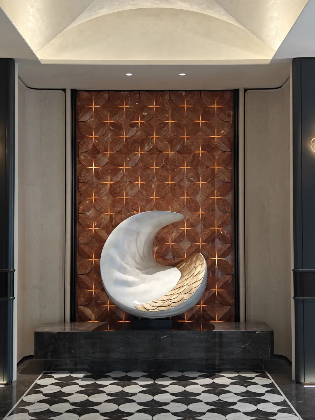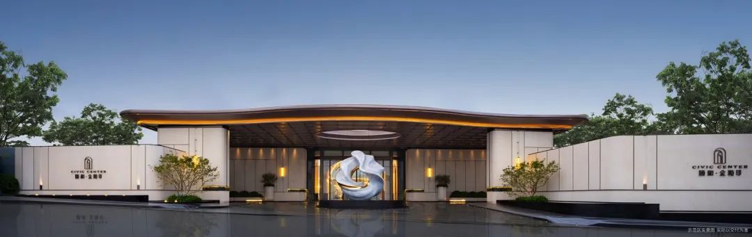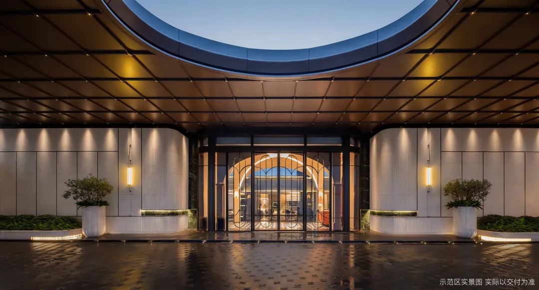 项目打造了酒店式落客环岛,顶部搭配了鎏金线条、弧形挑檐,实用性和美感兼具。