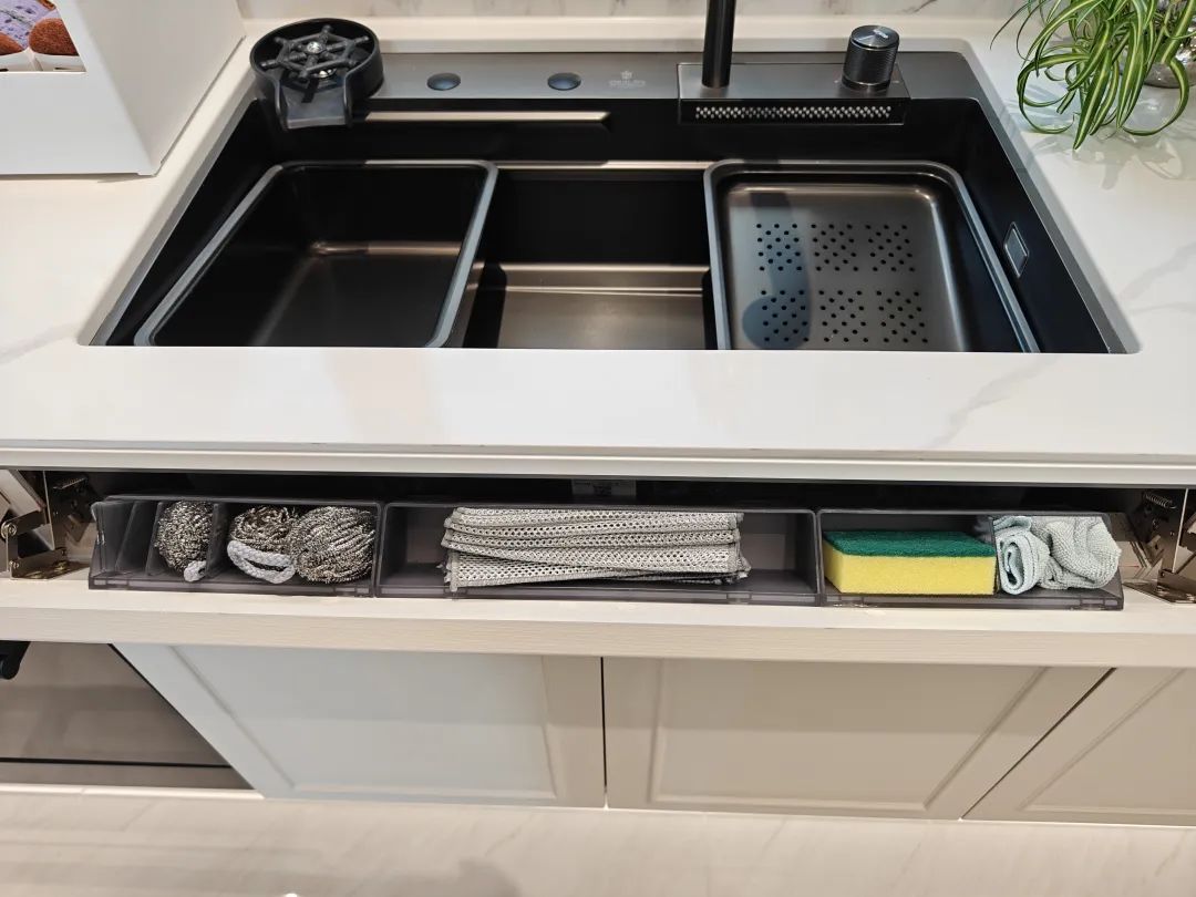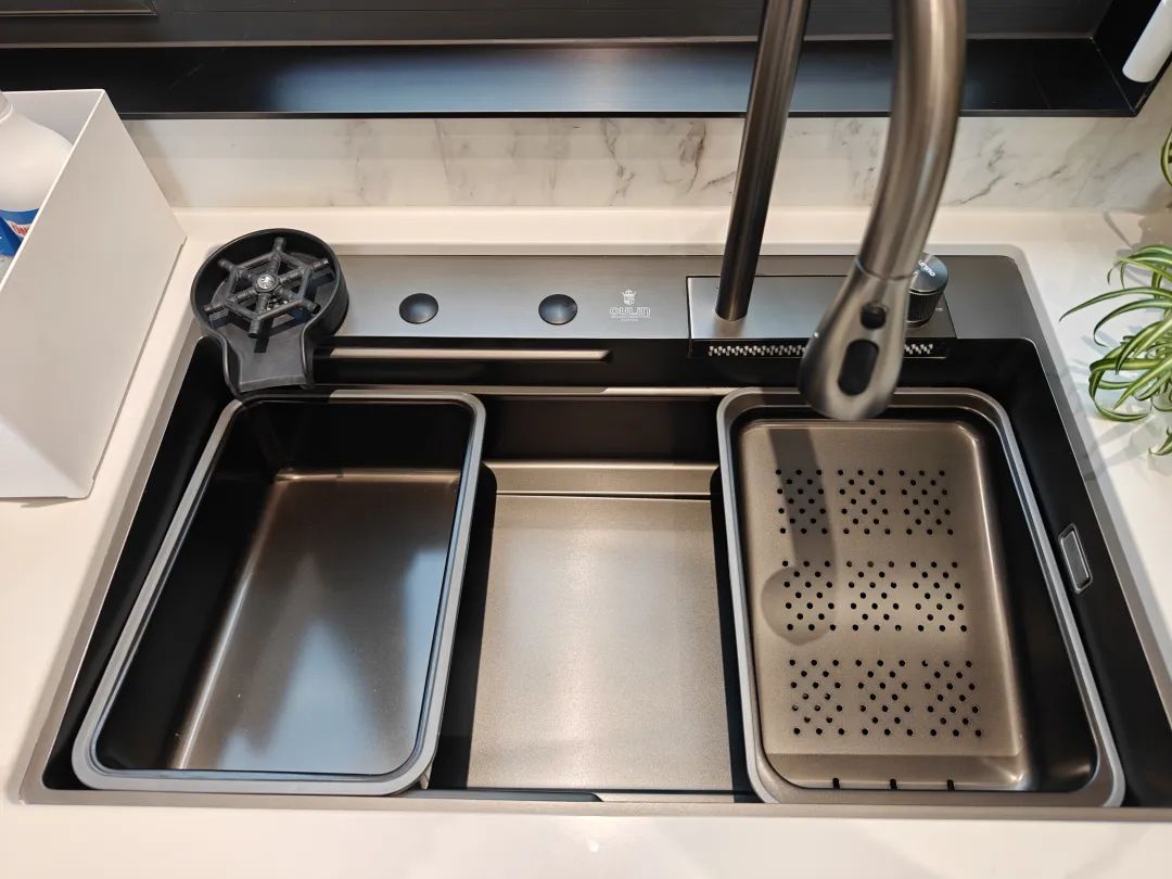 相较于传统的水槽,这个欧琳多功能水槽更加贴近生活使用场景,配备了冲杯器、瀑布洗功能,更加方便。