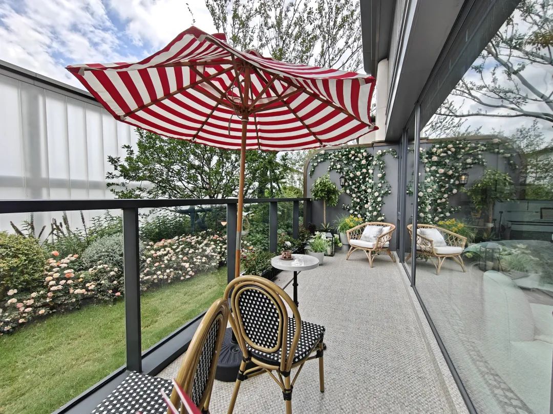 与客厅相连接的是一个超大尺寸的露台空间,露台大约14㎡,全是赠送面积。露台还采用了地毯砖,更加防滑、质感更好。