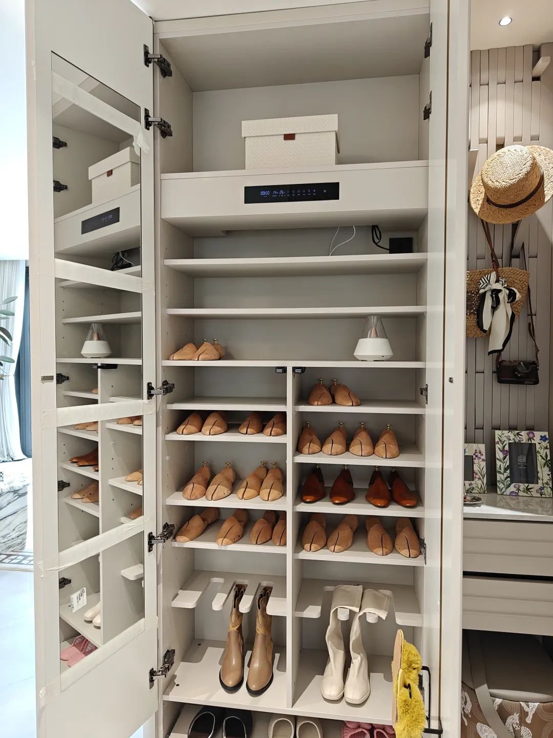 打开玄关柜不难发现,整个柜体空间非常之大,柜体内配备了鞋柜精灵,左侧打造了全身镜,下方还有踢脚抽,并且预留了高筒靴以及鞋盒的摆放空间,考虑的非常周到。
