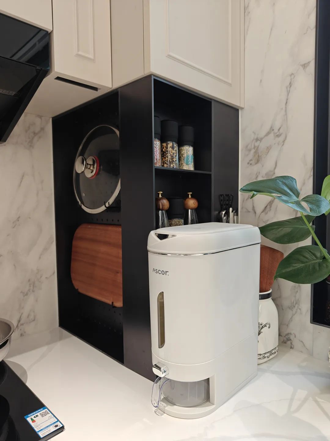 项目还将厨房内的烟机检修口也做了储物空间的优化设计,面板上可放置锅盖、调味品都厨房用具。