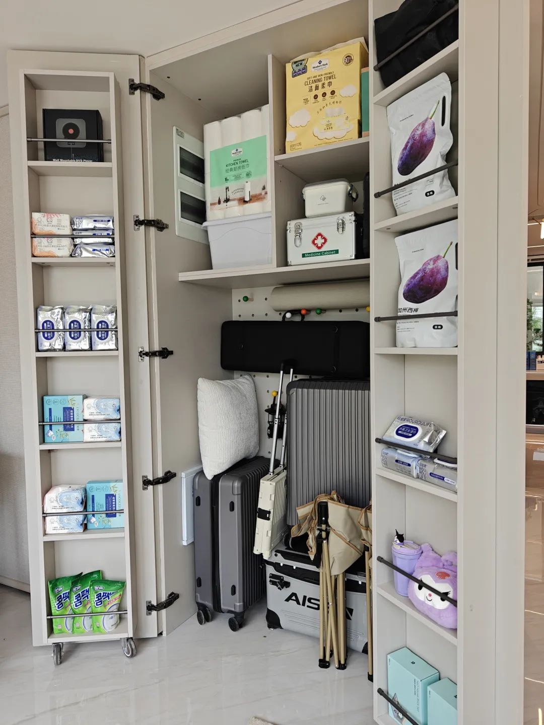 来到玄关柜的背面,是一个超大的柜体储物空间,你的婴儿车、旅行箱、露营椅、垂钓设备都有了一个更加规整的容纳空间。