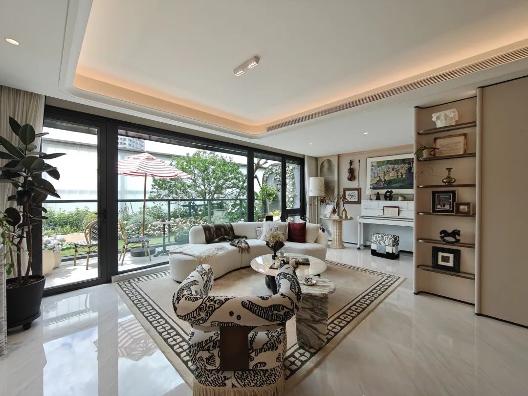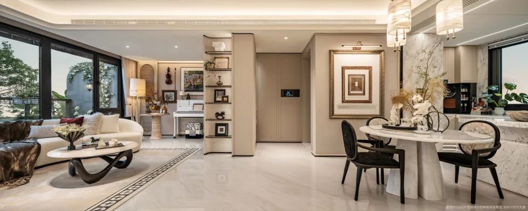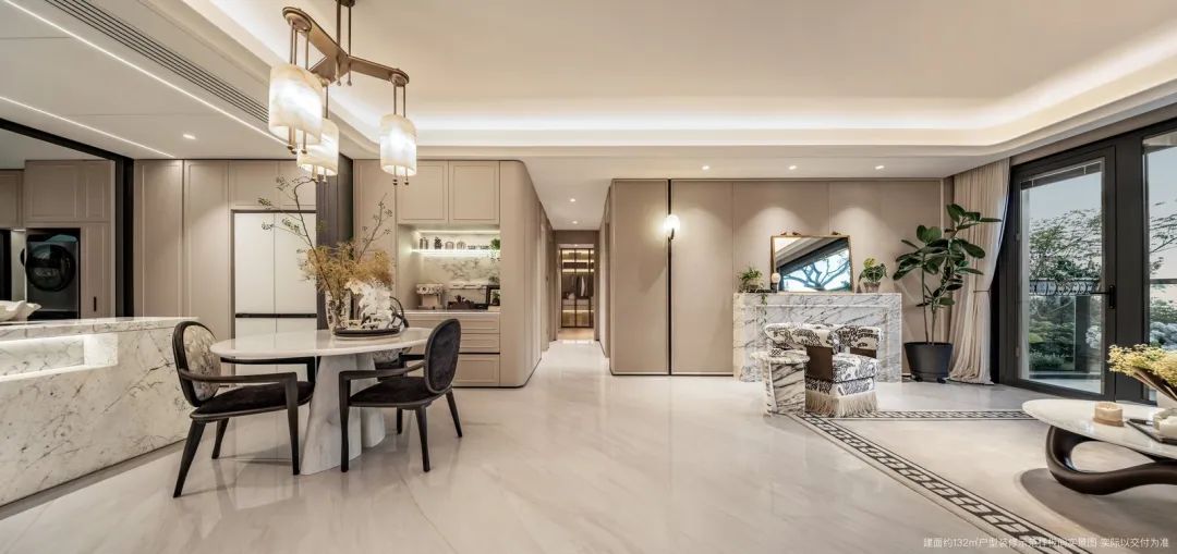 进入到建面约132㎡样板间内,给我的第一感受就是通透感很强,这得益于约3.1米的层高,地面采用了90*180的地砖通铺,外加超大的落地窗,视觉效果拉满。