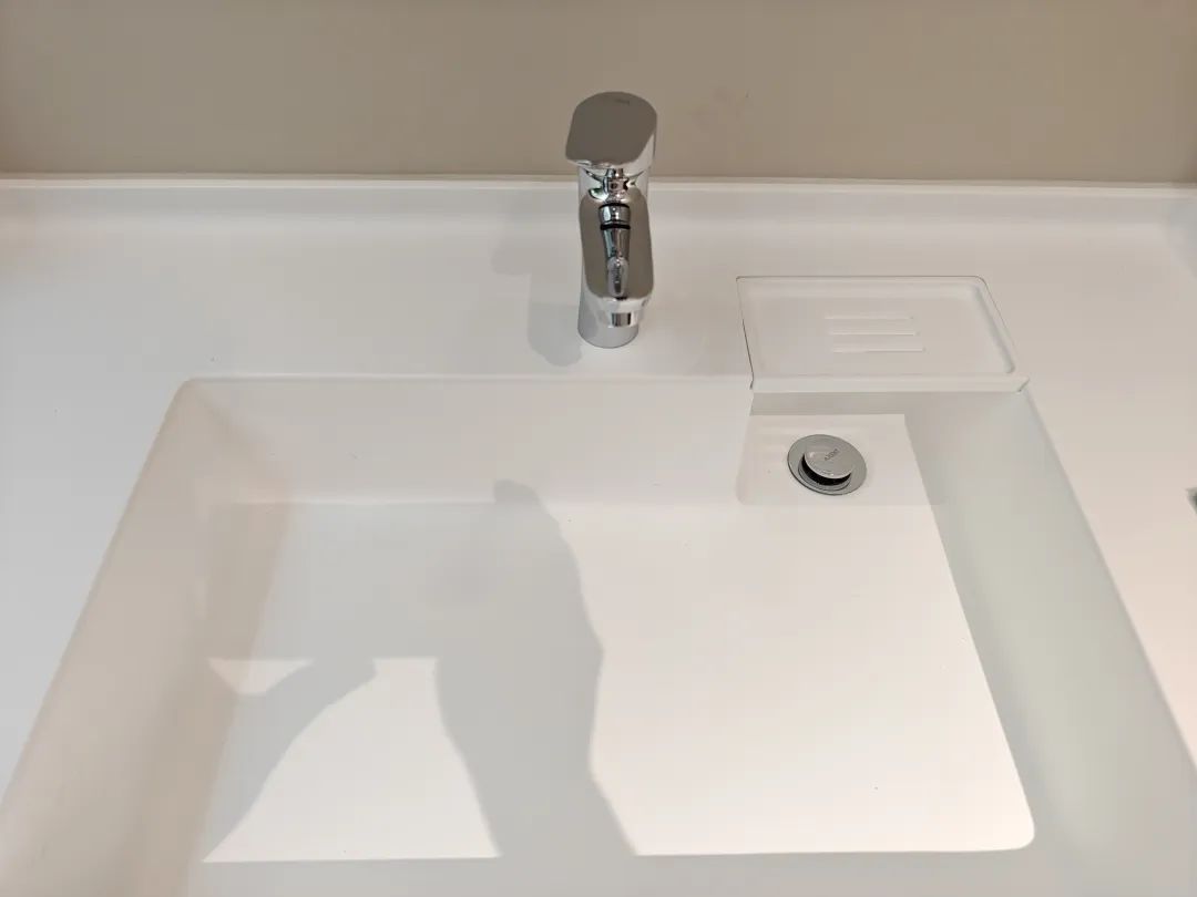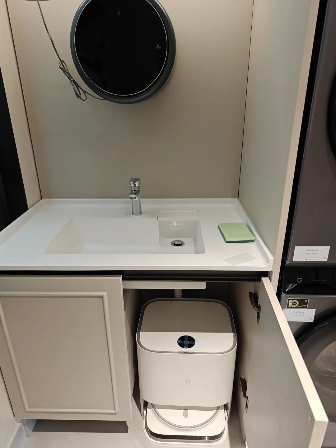 而在台盆处,为了让下方储物空间最大化,特意将下水口放在角落,从而获得更多的下部空间,可放置更大的扫地机器人。