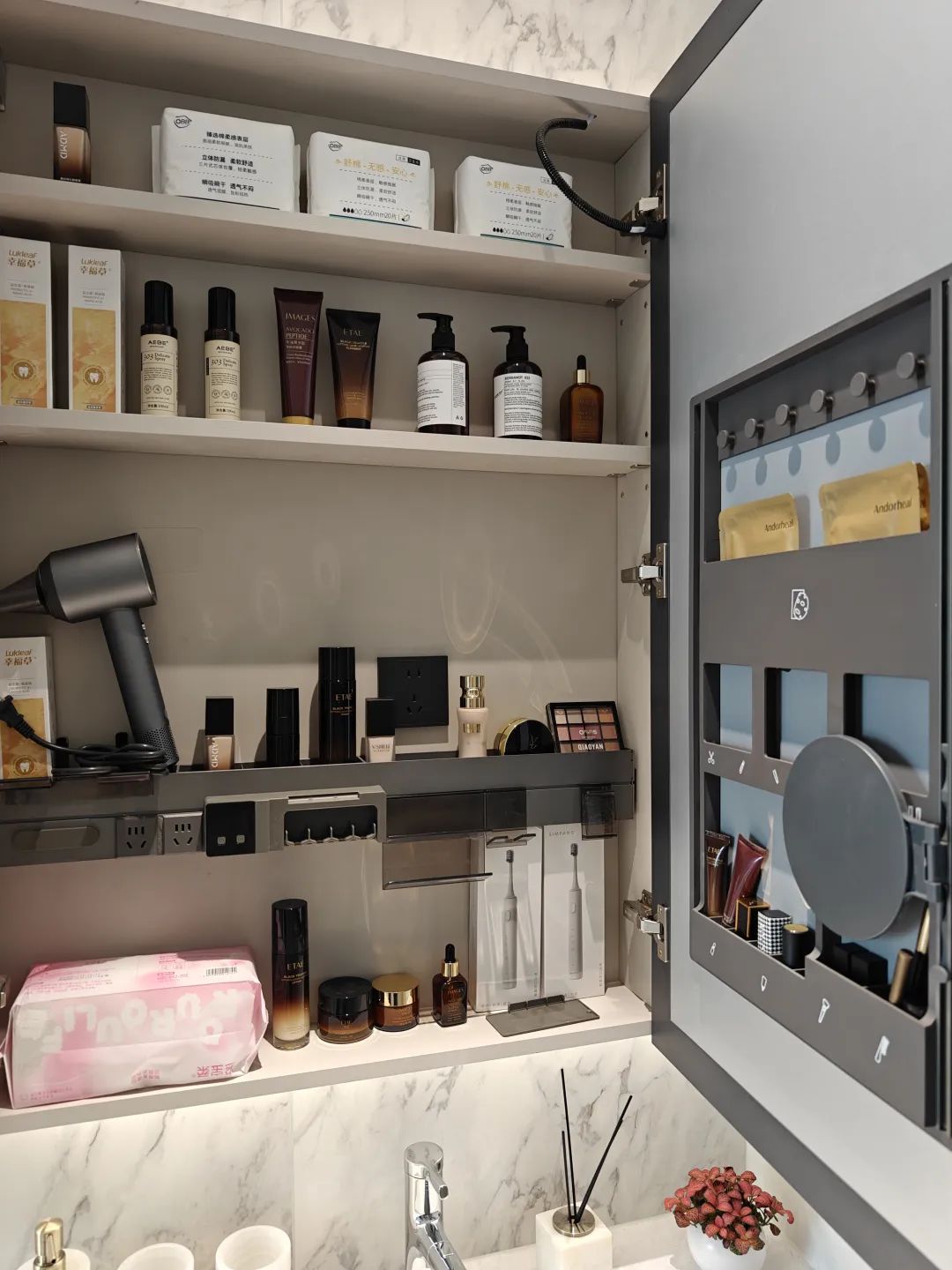 值得注意的是,在镜柜中我们还能看到颐和·金陵印的细节把控,镜柜内设置了可以摆放牙刷的空间并能进行消毒,还配备了一个有放大功能的化妆镜,此外,在镜柜下方留出了一个摆放洗脸巾的位置,且是倒扣设置,可以直接抽取,非常方便。